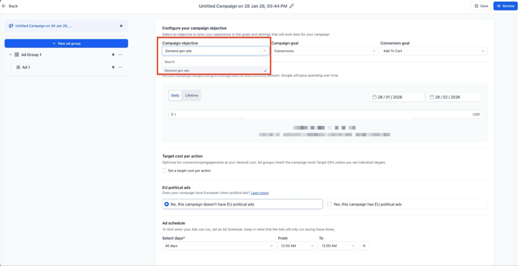 - Select the appropriate search engine platform and choose Demand Gen Ads as the objective.