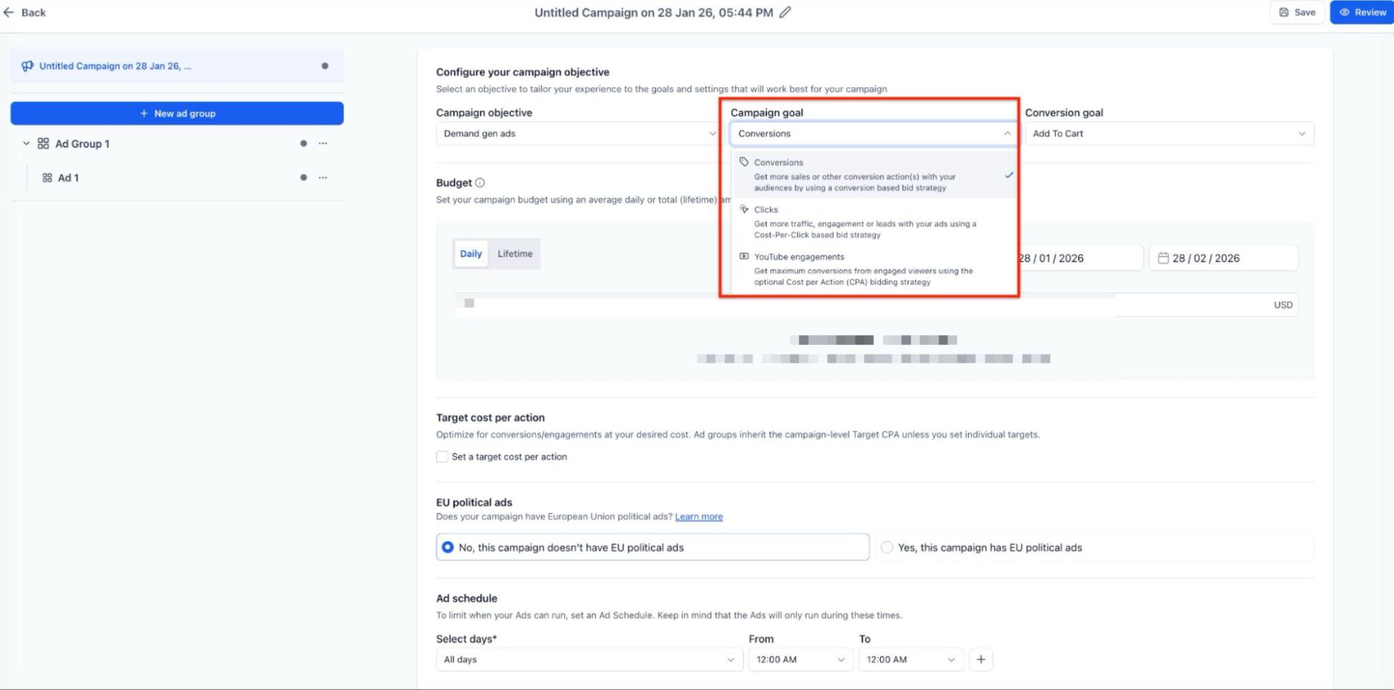 3. Define the campaign goal: Conversions, Clicks, or YouTube Engagements.