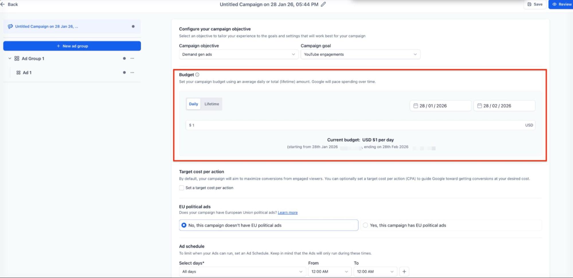 4. Configure the financial settings, including the daily or lifetime budget, and set the start and end dates.