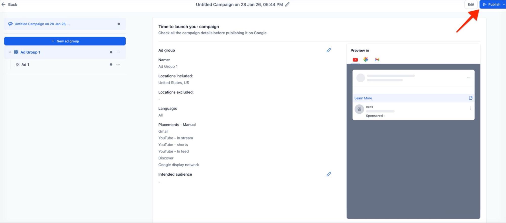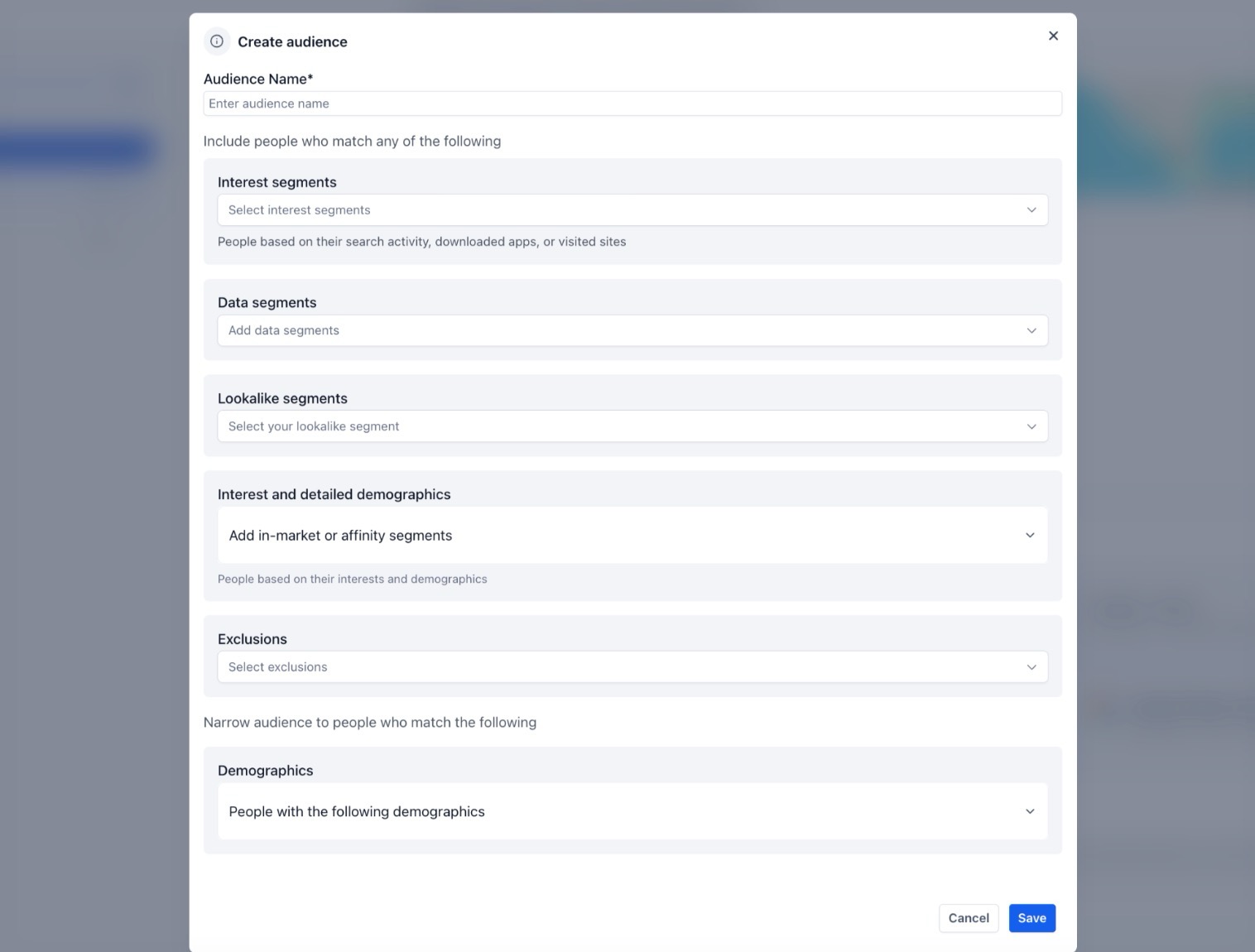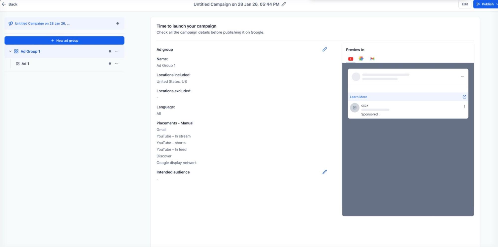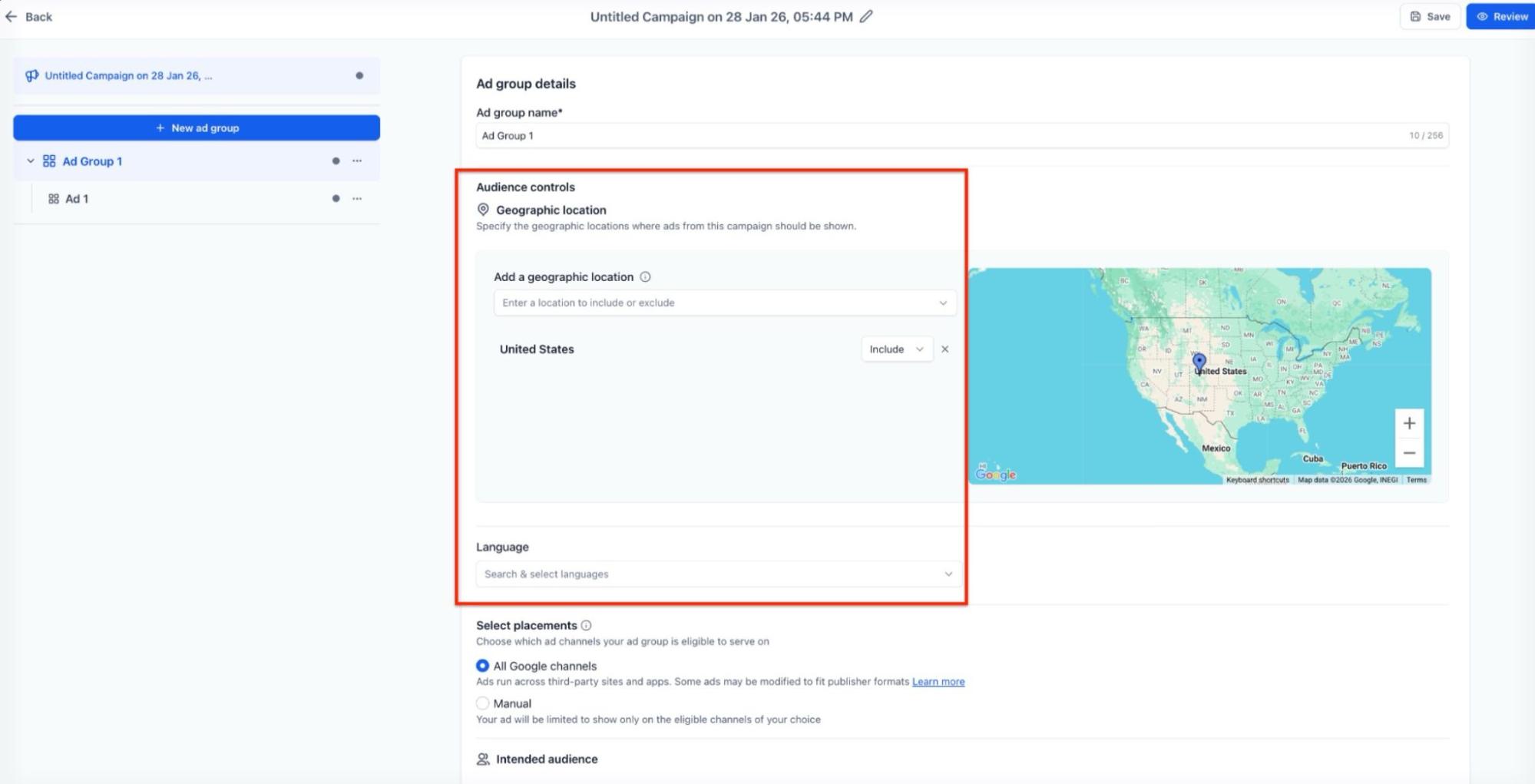Section titled “3. Granular Targeting and Audience Building”The ad group level settings provide deep control over who sees the content. Users can define geographic locations, languages, and specific placements. The built-in audience builder allows for the creation of interest-based groups, in-market segments, remarketing lists, and lookalike audiences to find new potential customers similar to existing ones.