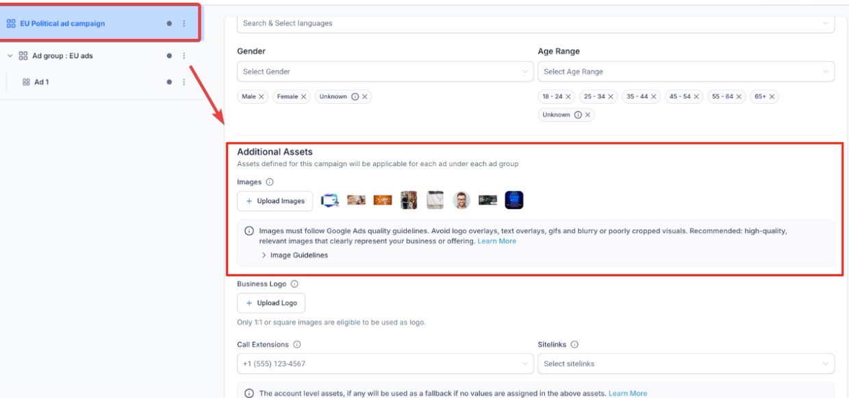 Section titled “1. Adding a Business Logo”- Navigate to the Additional Assets section when setting up or editing a Google ad campaign.