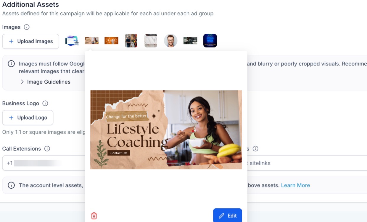 Image assets can be added to search ad campaigns to enhance visual appeal and boost engagement across various ad placements. To use this, In the Additional Assets section, select Upload Images to begin.