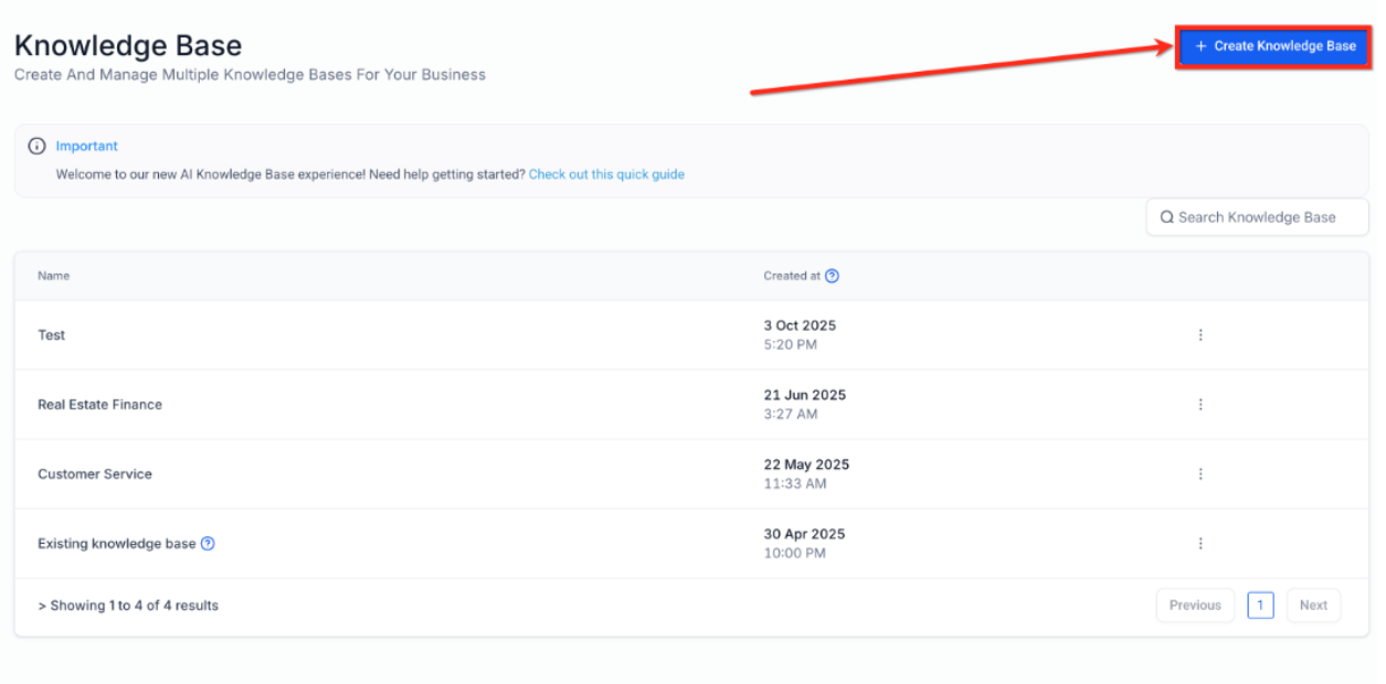 Section titled “How to Use Knowledge Sources Support”- Access Knowledge Base: Navigate to the Knowledge Base section under AI Agents within your dashboard.