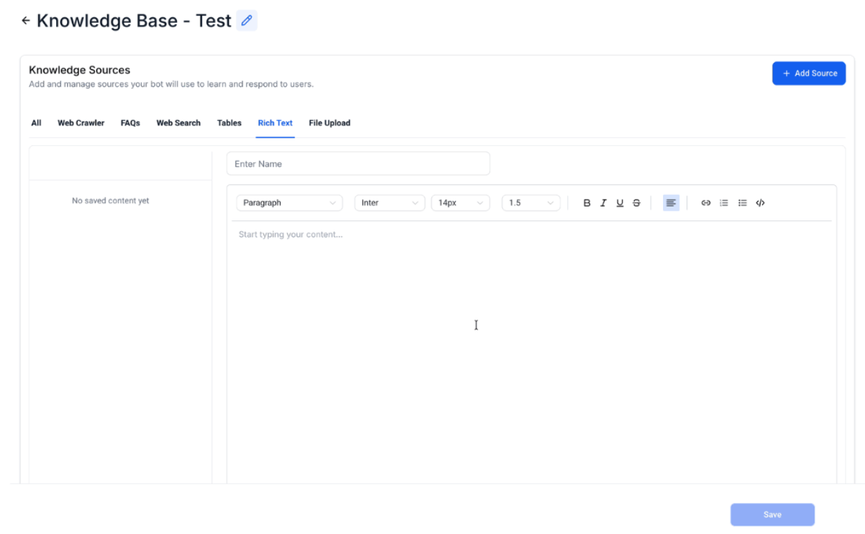 The Knowledge Sources Support feature empowers businesses to enhance their conversational AI systems by enabling them to learn directly from diverse content types such as tables, rich-text documents, and uploaded files. The purpose of this capability is to make AI-driven responses more precise, transparent, and context-aware, helping teams deliver faster and more reliable answers to customer inquiries.