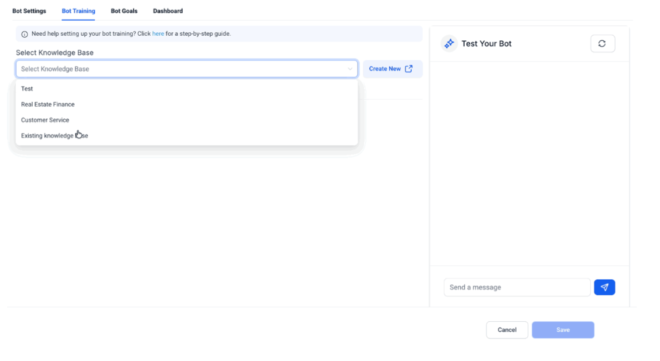 3. Attach to a Bot: Open your Conversation AI bot and select the Knowledge Base that includes your uploaded or created sources.