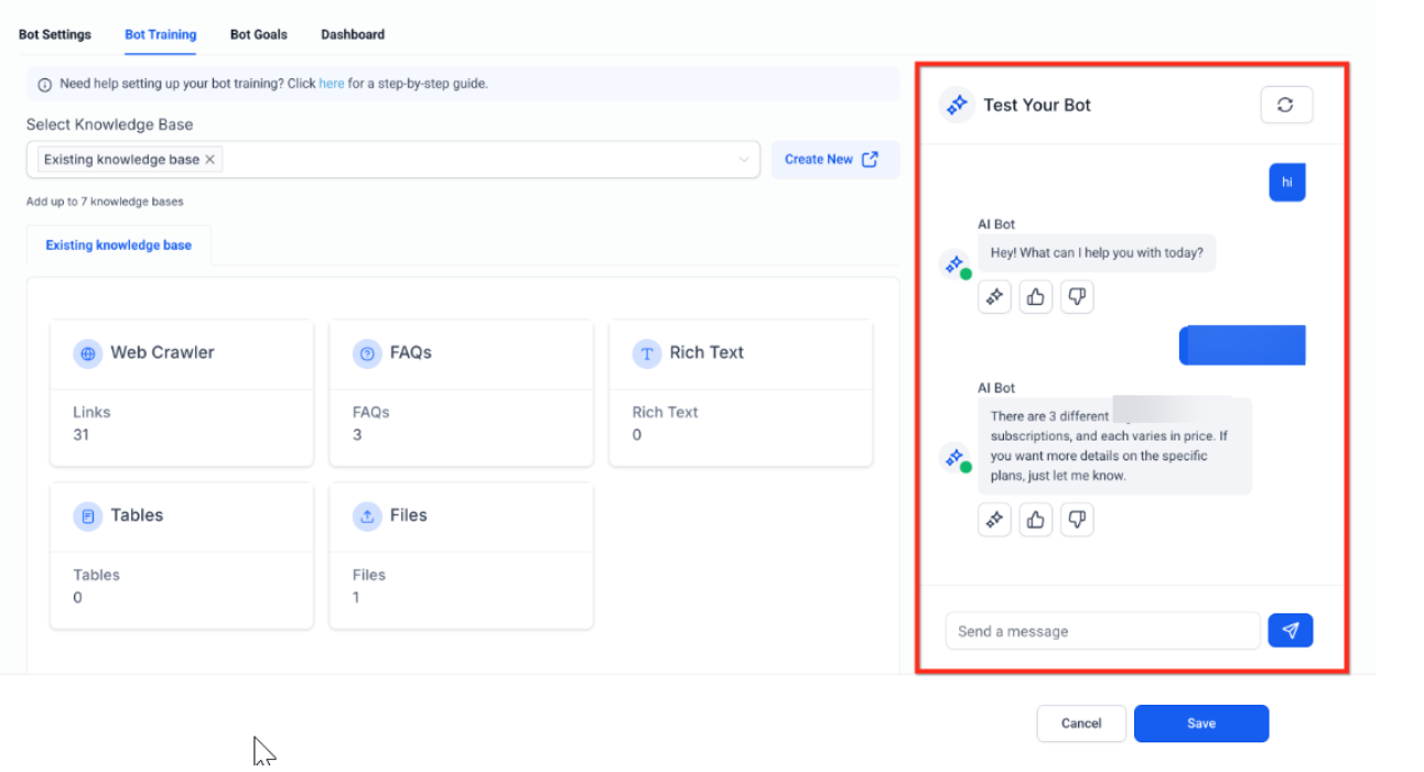 4. Test the Bot: Ask different questions in the testing window to evaluate how effectively it retrieves information.