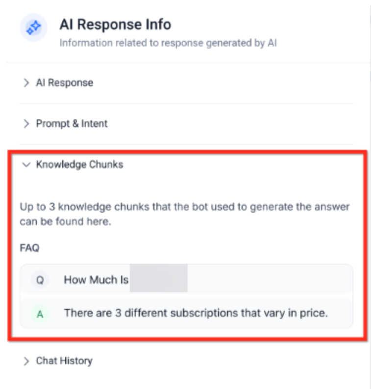 Question: How can I verify which data the AI used in its response?Answer**: Click on the Response Info icon next to any AI-generated message to see the exact source and snippet used.