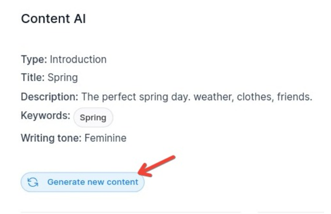 Question: What happens if I want to regenerate specific sections of my content? Answer: You can regenerate specific sections of your content by clicking on the Content AI button and selecting the section you want to update. Then, choose “Generate new content” to refresh that section.