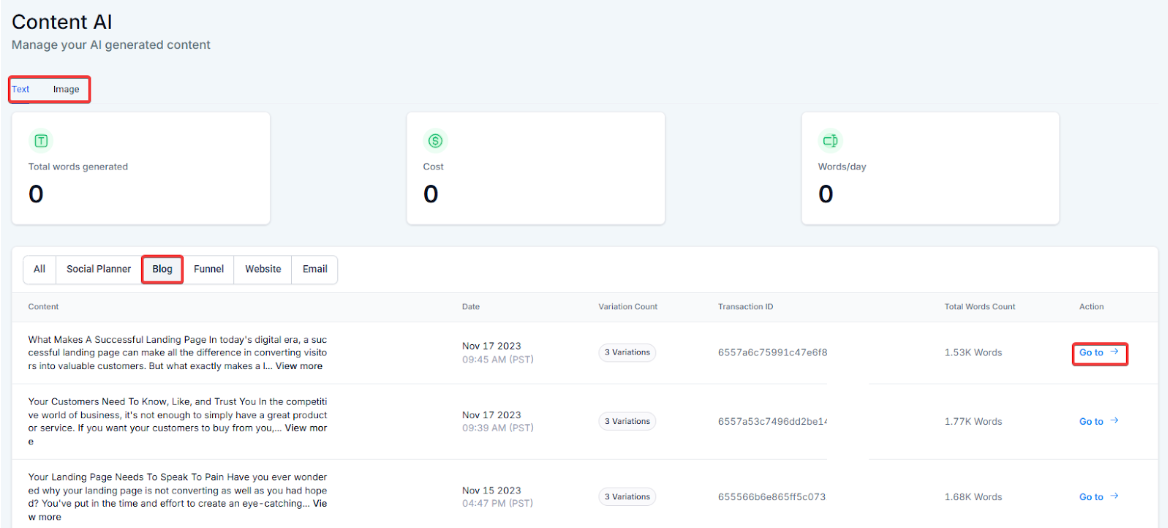 Please Note: You can manage the Content AI and view history from AI Agents (on the left) > Content AI tab at the top