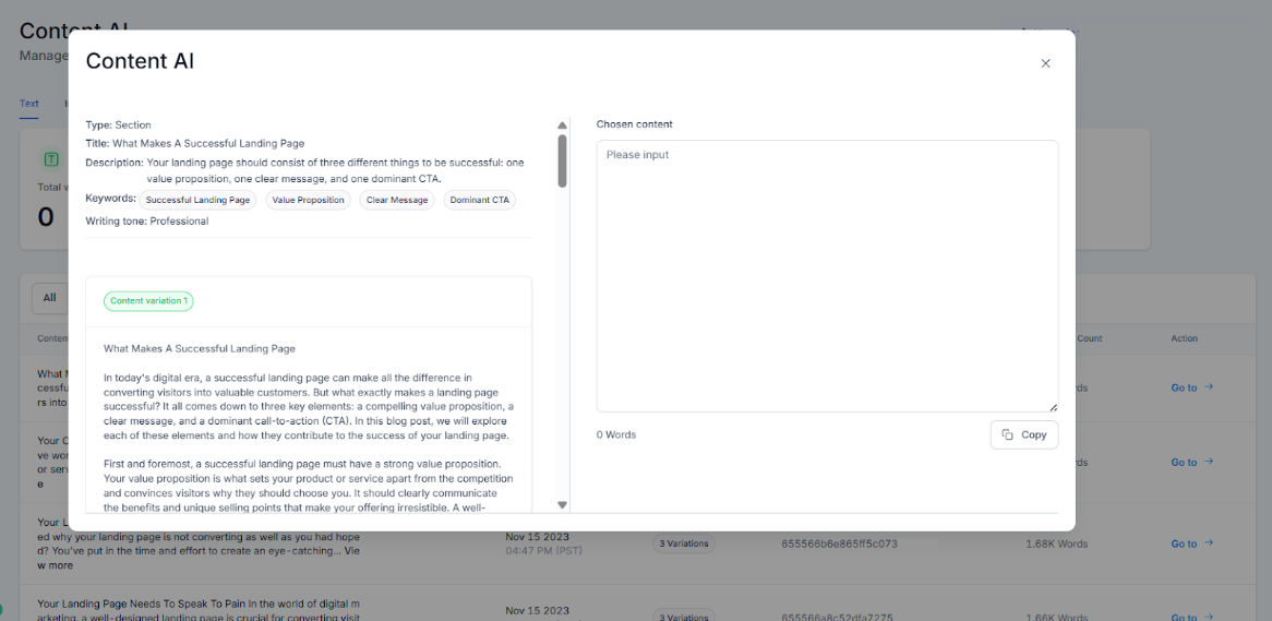 - Full Sections - AI can create full sections of copy under each headline.