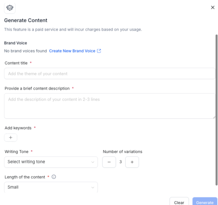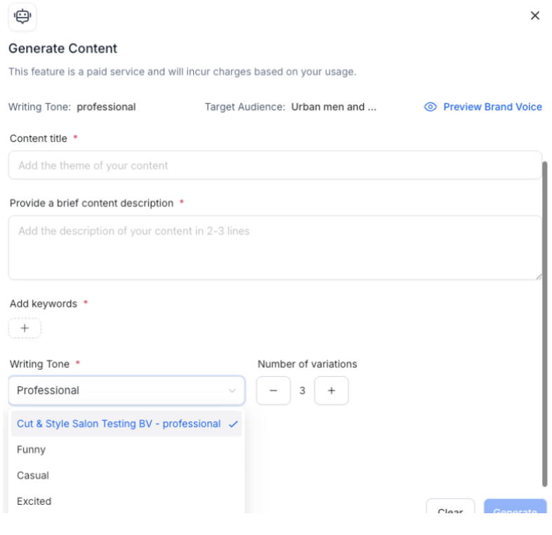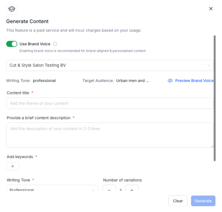 Brand Voice Selector Dropdown: Choose your preferred Brand Voice from saved options, with your default pre-selected.