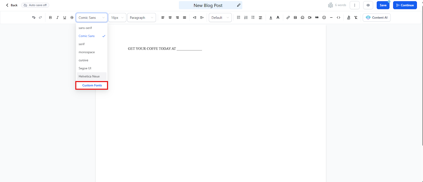 - When you are updating a blog or creating a new one, click on the font drop-down menu, select Custom Fonts
