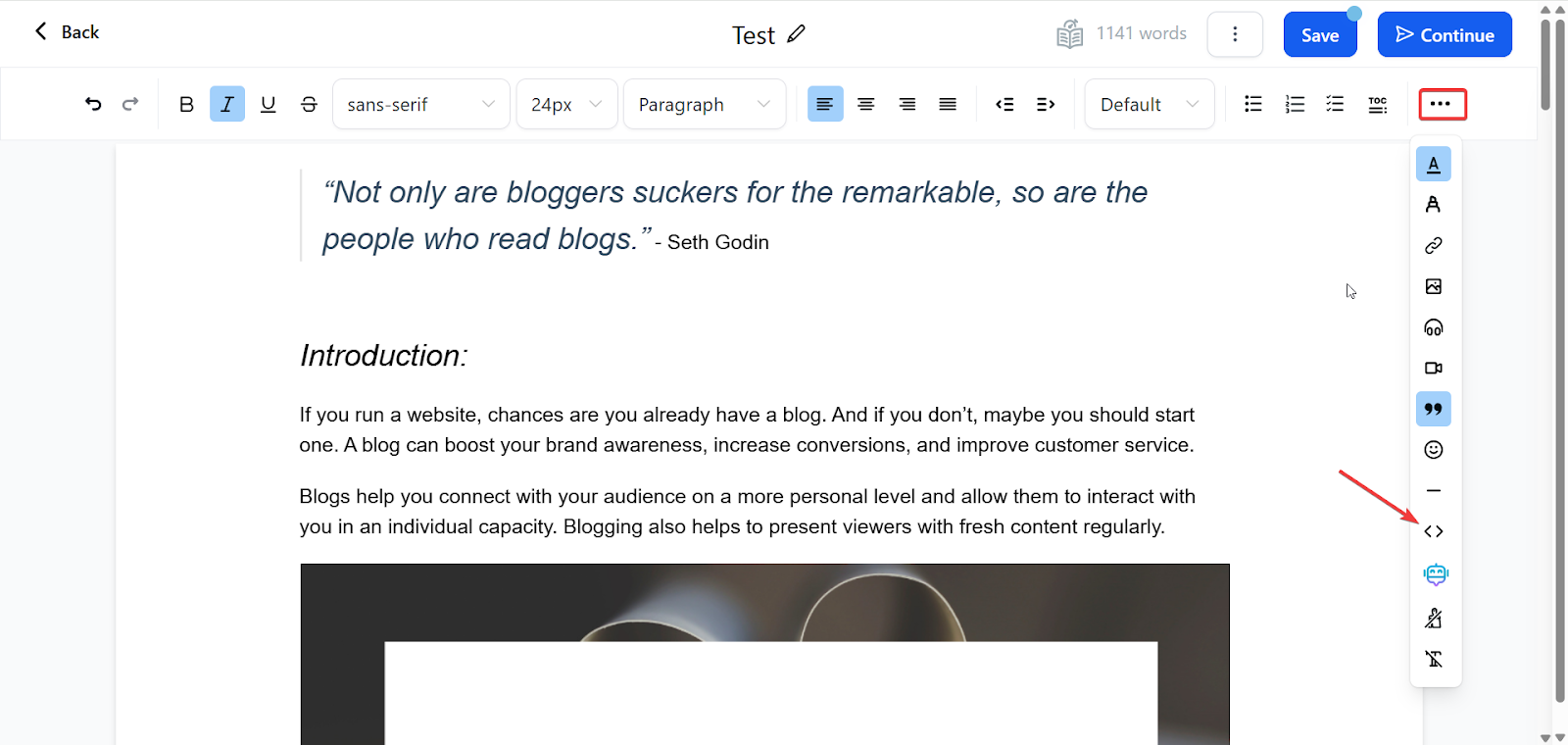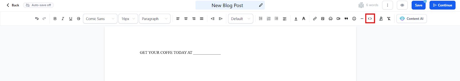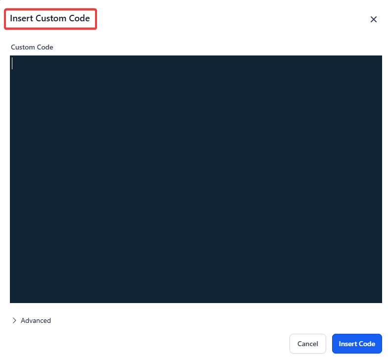 - When you are within the blog, you would click on the Insert Custom Code symbol, paste the code into the box, and select Insert Code