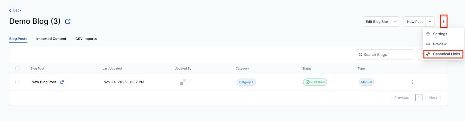 - To use this feature, navigate to Sites > Blogs, select the blog, and access the Canonical Settings from the three-dot menu.