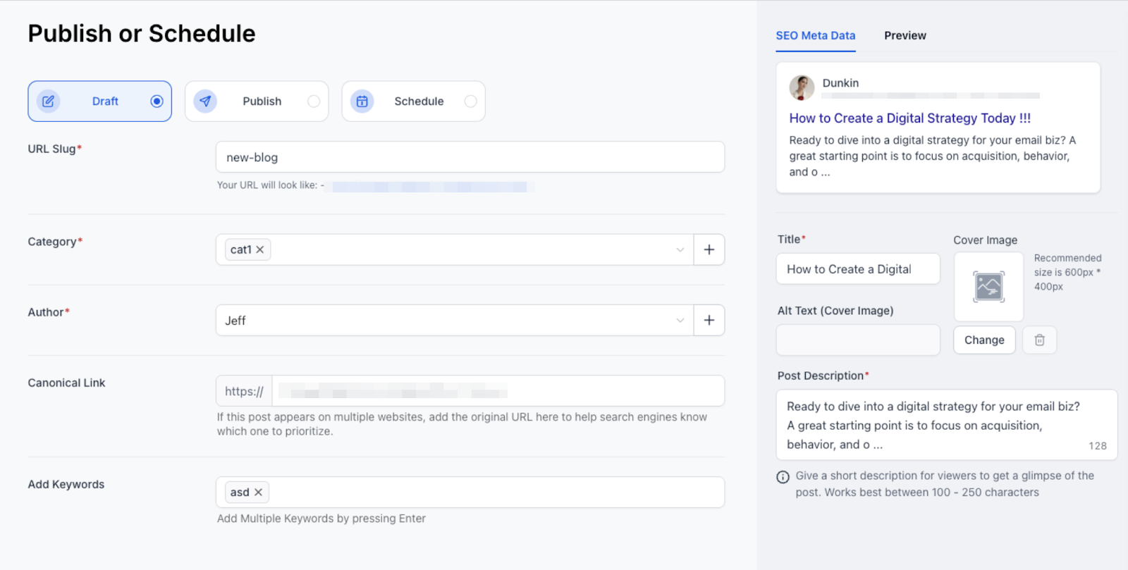 Section titled “5. Following adding and customizing the content, you will be required to set up the details”- URL Slug - This will be the path for your blog post