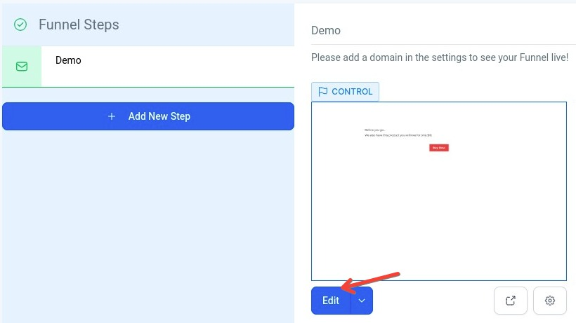 Section titled “2. Once the funnel step is added, go to the edit button to land on the editor”