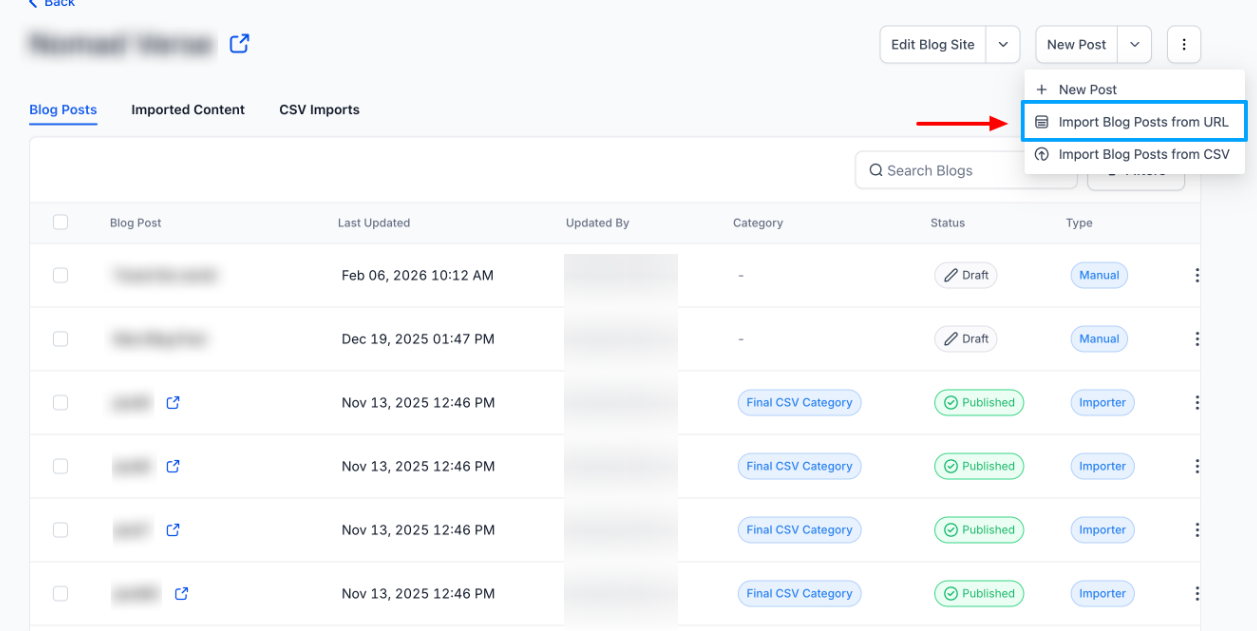 - Go to New Post > Import Blog Post, enter the blog URL, and the recent blog post URL. Confirm the import source.