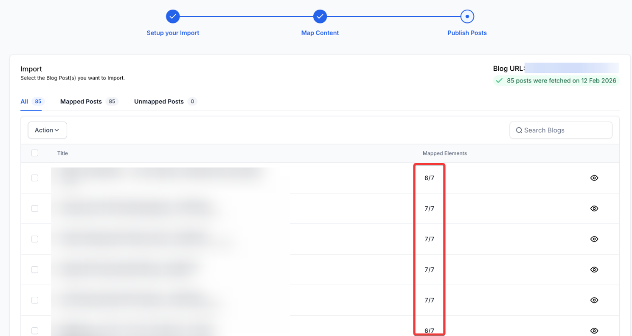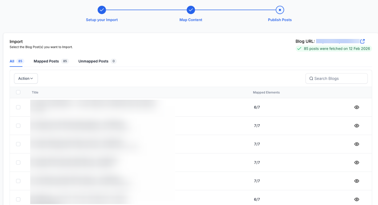 - Once mapping is complete (usually 10-20 minutes for up to 1,000 posts), import posts individually or in bulk. All posts will initially be imported as drafts.