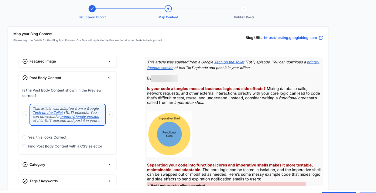 **Question:What if the blog preview doesn’t display during the Blog Post Import process? Answer: If the iframe is blocked, the preview won’t appear, but you can still proceed with mapping and import as usual.