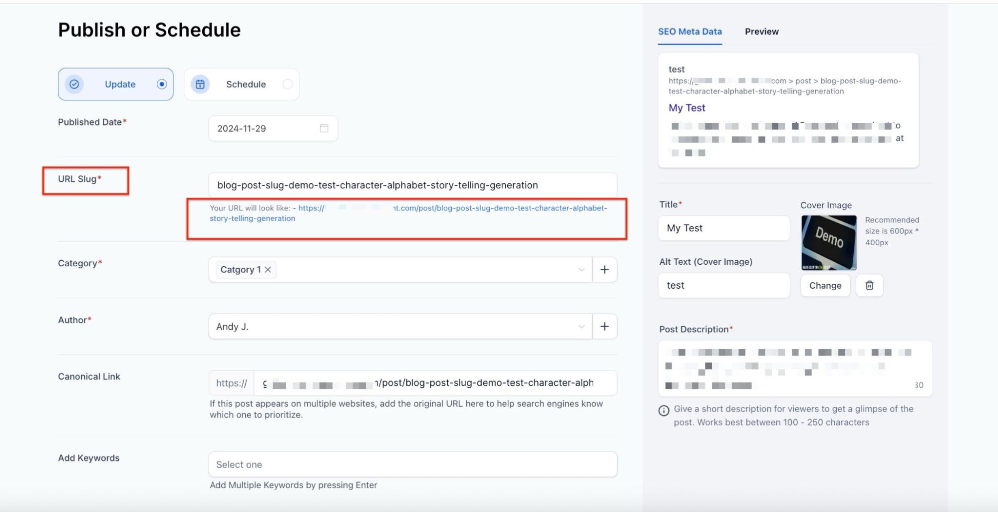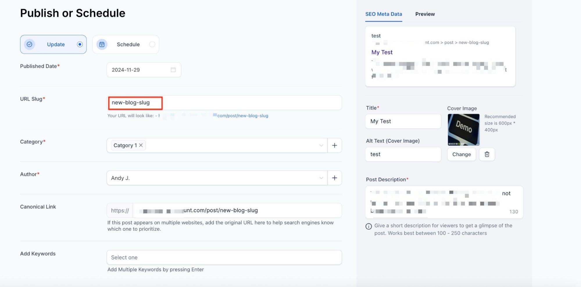 Section titled “1. Simplify Your URLs”When creating a new blog post, ensure that your URLs are short and contain relevant keywords. Avoid using unnecessary characters or long strings of text in the URL. The update automatically simplifies URLs, but you can further adjust them for maximum SEO benefit.