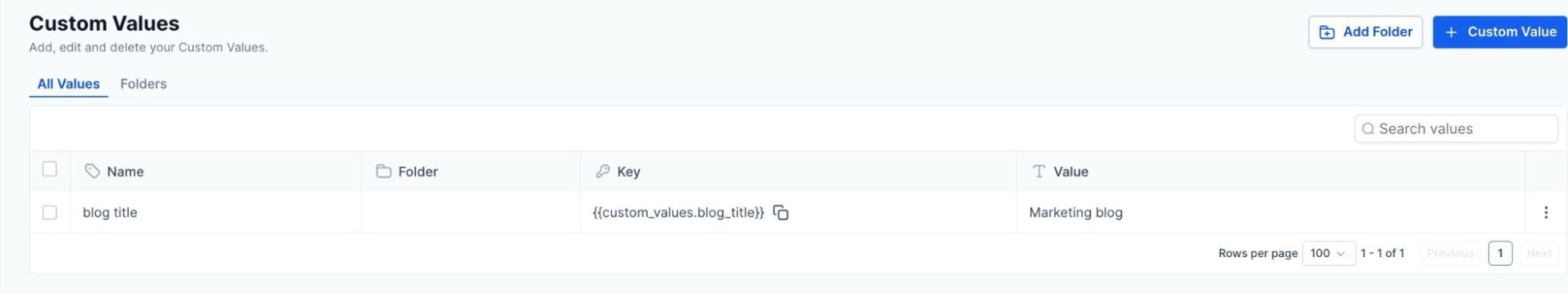 1- Navigate to the settings menu and create custom values under the “Custom Values” tab.