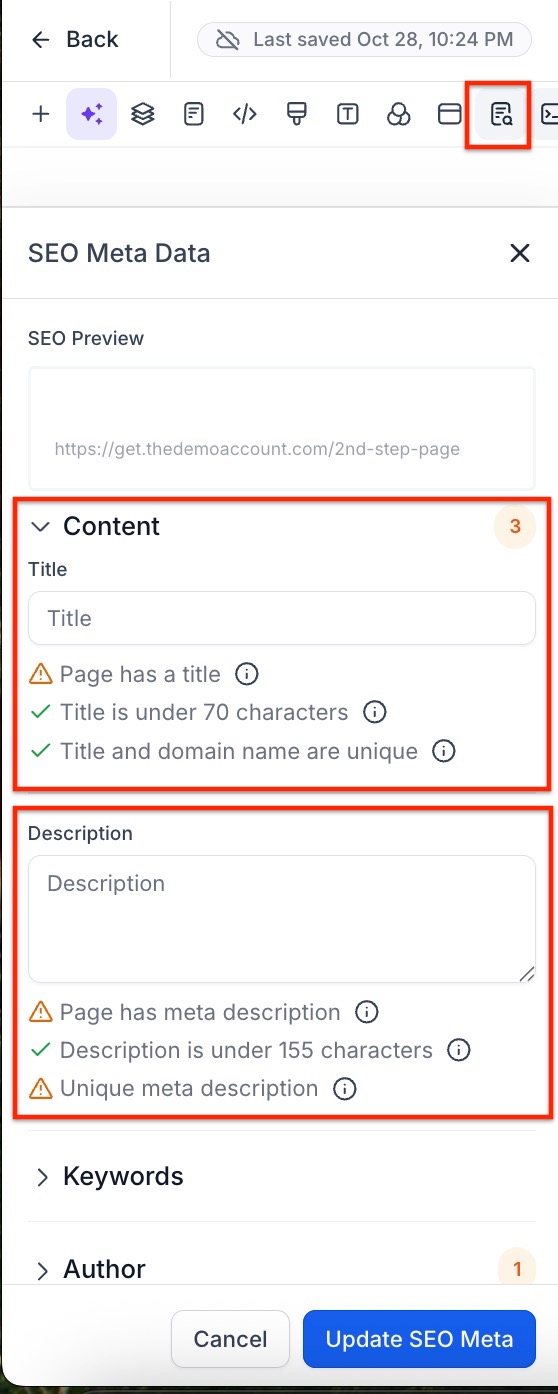 Section titled “4. Optimize Meta Data”SEO metadata, including titles, descriptions, and keywords, plays a crucial role in how your content is indexed and ranked by search engines. The blog builder allows you to easily manage this metadata for each blog post.