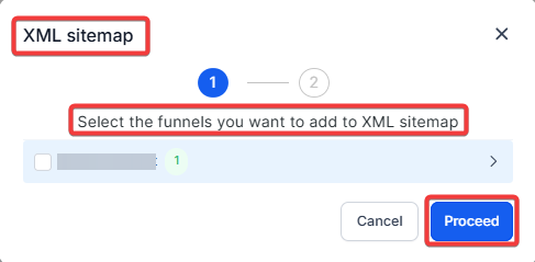 Section titled “If needed, provide a custom path and then follow these steps:”Step 1: Once you select the funnel/website page in the XML menu, click on “Continue.”