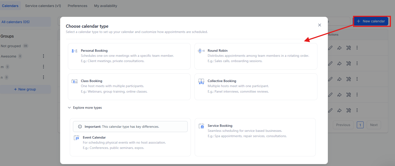 Section titled “Step 2: Choose the Calendar Type”- Select the Round Robin Booking option under calendar types.