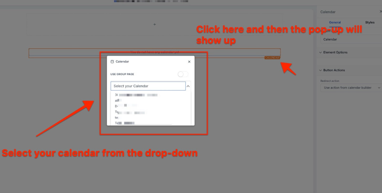 2- Choose the Calendar: After adding the calendar element, select the required calendar from the pop-up. After you are done editing, remember to save the changes.