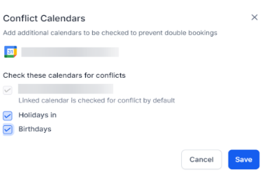 Question: How do I handle conflicts between my calendars? Answer: Use the Conflict Calendar settings to manage overlapping events. Events marked as ‘BUSY’ in the third-party calendar will block your availability, while ‘FREE’ events will not affect your availability. You can add multiple calendars to avoid double bookings.