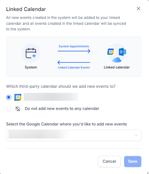 All new events created in the system will be added to your linked calendar. For example, any new event created in the system will sync to your linked calendar, allowing you to view it directly on this third-party calendar (e.g., Google).