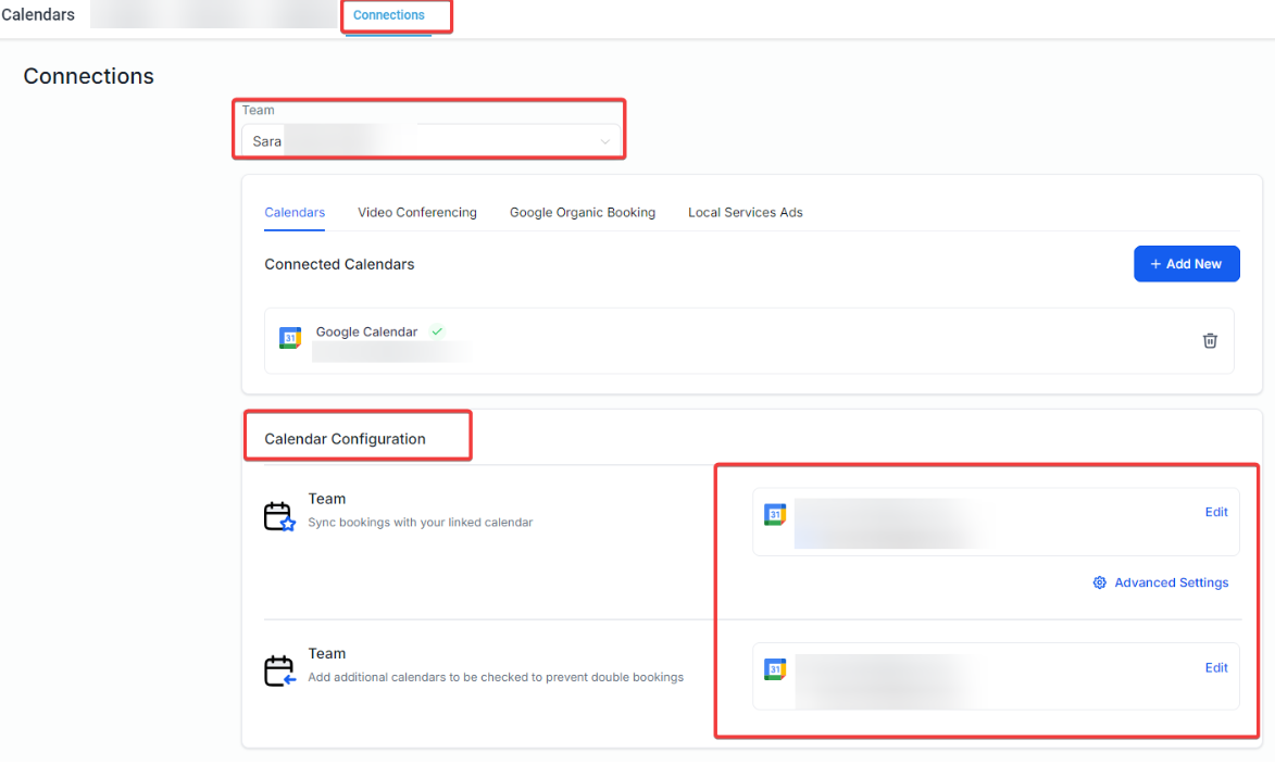 Calendar configuration involves two settings: Linked Calendar & Conflict Calendar. Make sure to select a particular team member.