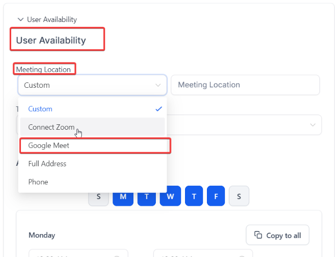 - Choose Google Meet: Also, go to User Availability and select Google Meet as the Meeting Location.
