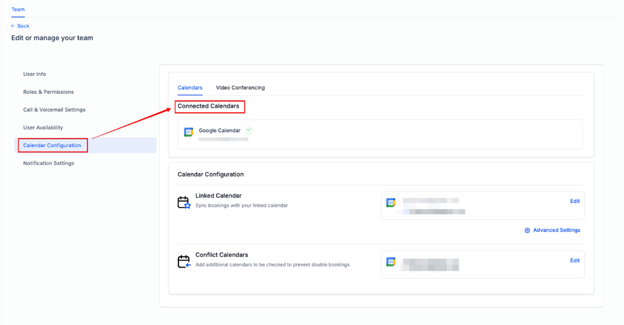 Section titled “Step 3: Setting up Google Calendar in Calendar Settings:”Once your Google account is successfully connected, you need to complete your calendar configuration by selecting your linked calendar and conflict calendar.