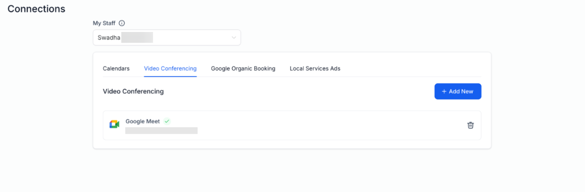 Section titled “Step 1: Connect your Google Calendar”With Google Descope, you can connect your Google Calendar directly through the Calendar Connections tab, eliminating the need to integrate your Google account in the integrations section. Once connected, Google Meet is automatically enabled. To generate Google Meet links for each appointment, ensure that a Google Calendar is set as the linked calendar. If no Google Calendar is linked, Google Meet links will not be generated.