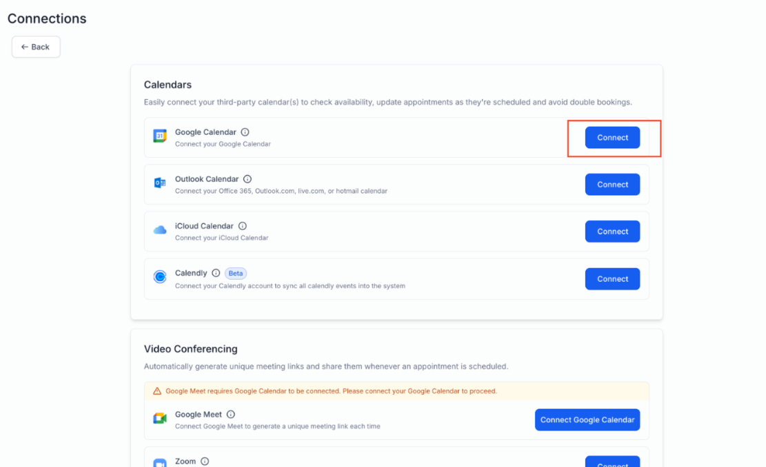 Question: How do I connect my Google Calendar? Answer: To connect your Google Calendar, navigate to either “Settings > My Profile > Calendar Settings” or “Calendars > Calendar Settings > Connections Tab.” Once connected, Google Meet will be automatically enabled, and Google Meet links will be generated for your appointments, as long as a Google Calendar is linked.