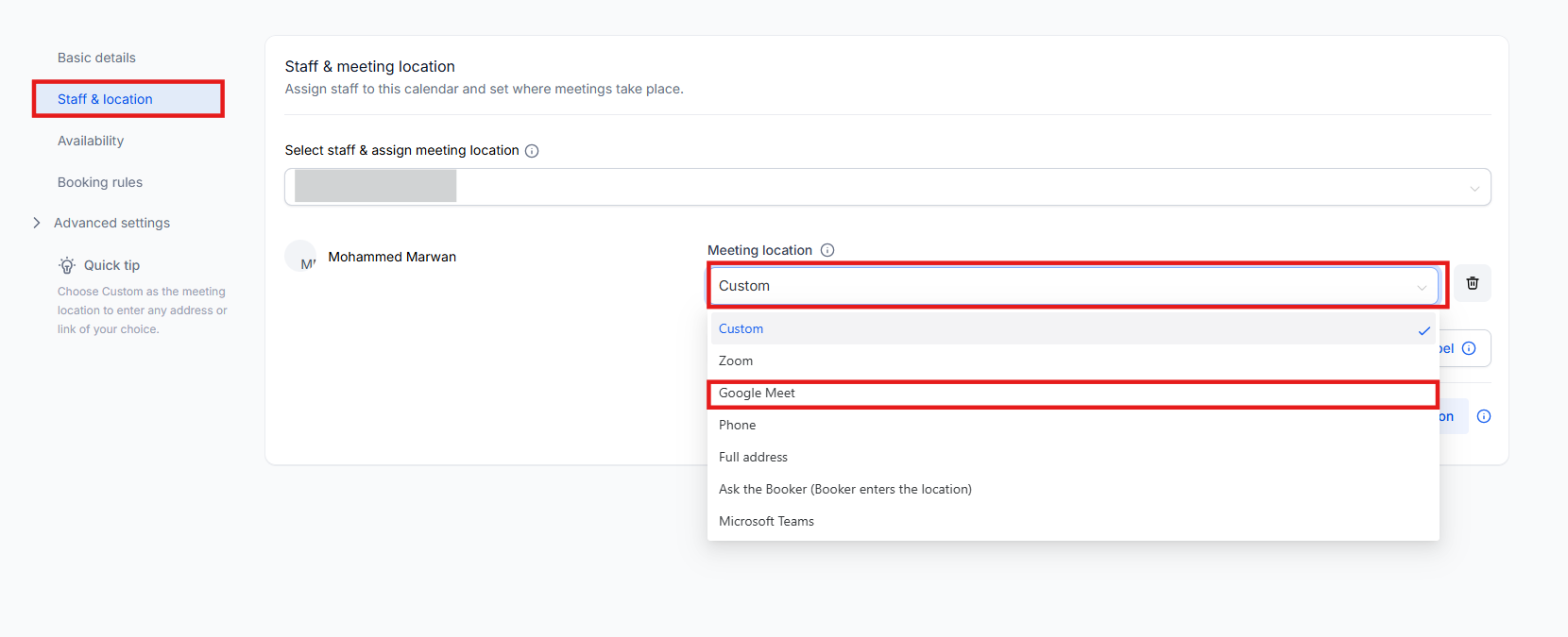 - In Staff & Location, select the team member and choose Google Meet as the meeting location.