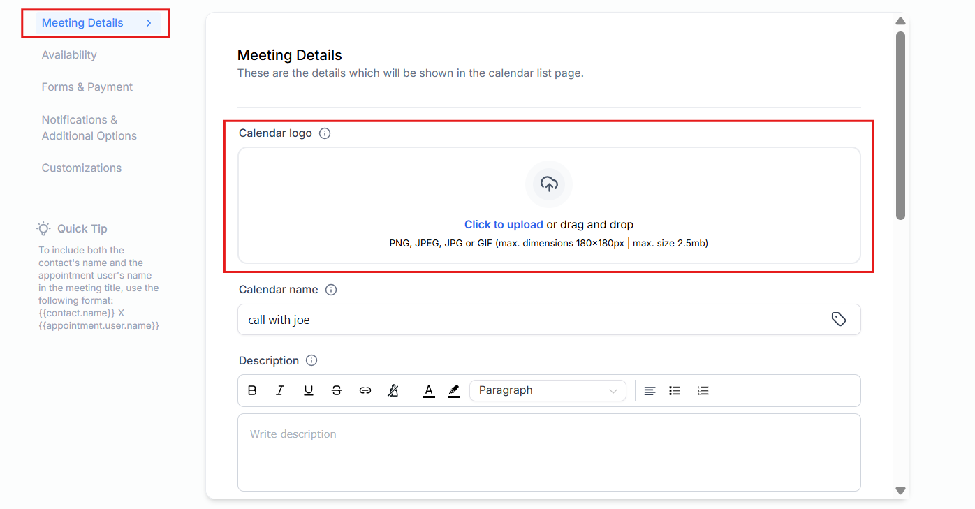 Question: Can I preview the logo on the Calendar widget before saving it? Answer: Typically, after uploading the logo in the Meeting Details tab, you should see a preview of how it will look on the Calendar widget. This allows you to make any necessary adjustments before finalizing the changes.