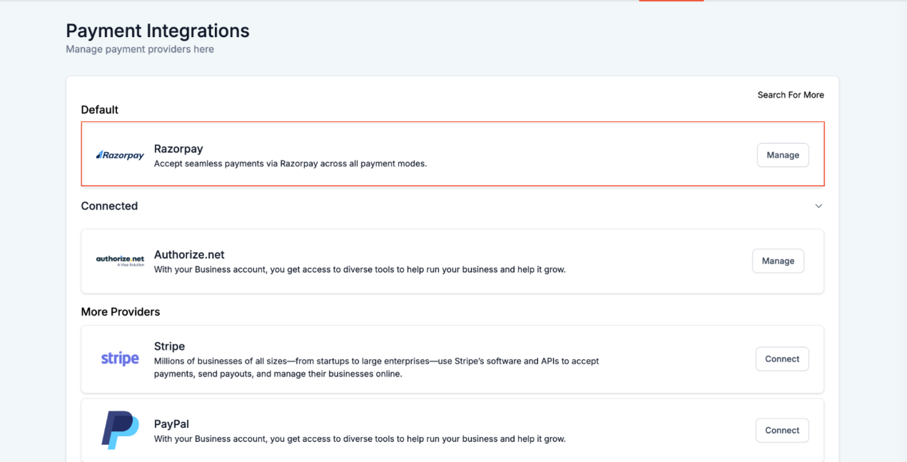 Section titled “1. Integrate Razorpay:”- Set Razorpay as Your Default Payment Provider: