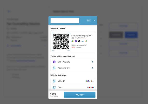 Question: Are there any currency restrictions for payment options? Answer: Yes, if you are using a currency other than INR, only the “Card” payment option will be available in the booking widget. Wallet, Net Banking, and UPI payment options are supported only in INR.