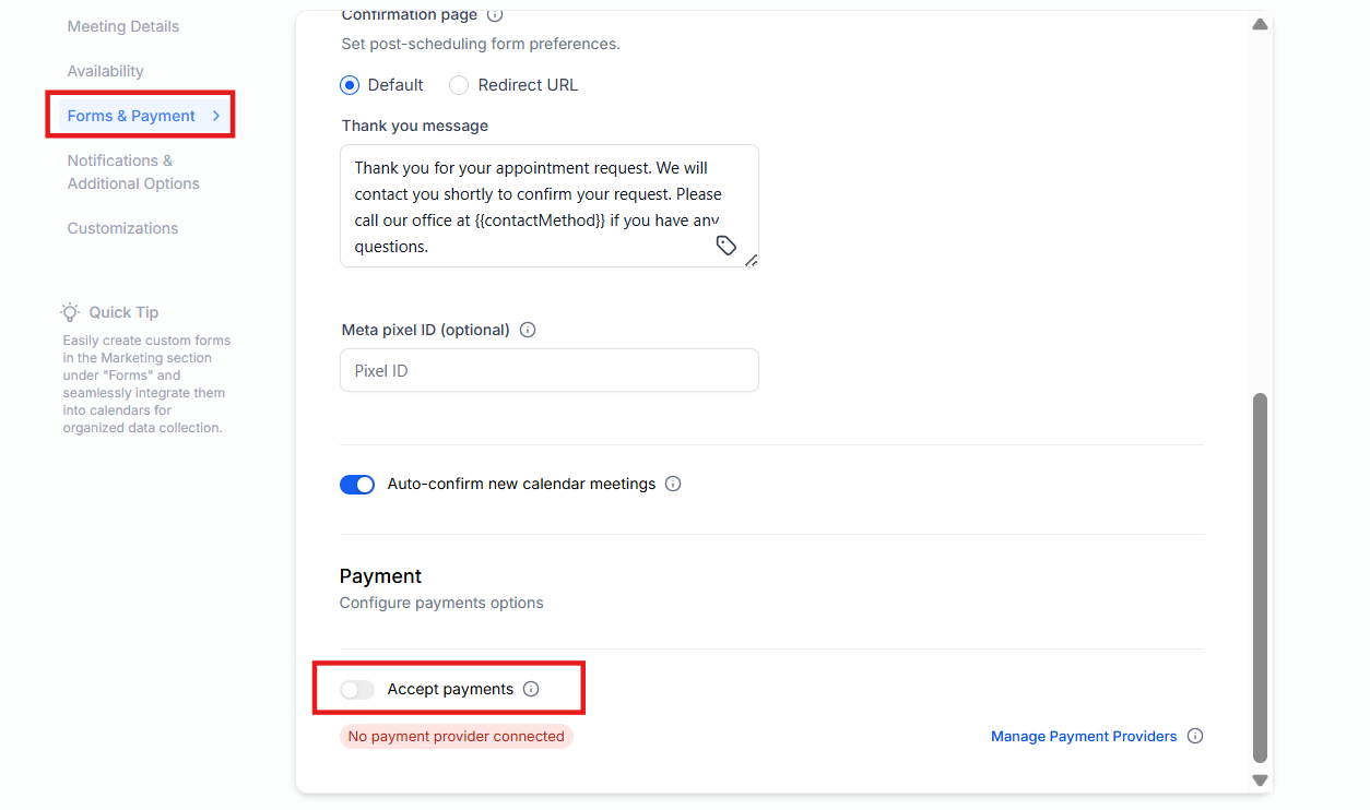 Section titled “2. Enable Payment Collection for Calendars:”To start collecting payments for bookings through your calendars: