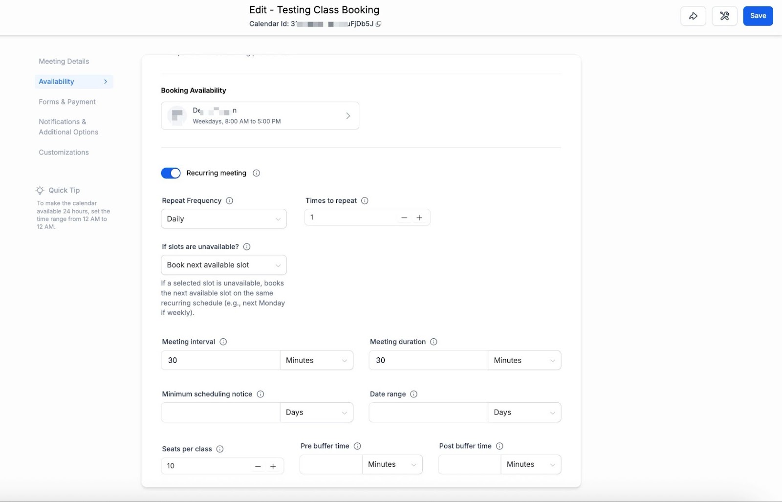 - Enable Recurring Meetings: In the Availability tab, toggle the option for Recurring Meetings.