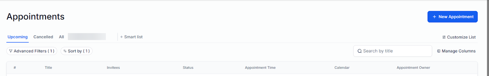 - Navigate to the Calendars tab > Appointments > Click on the ‘+ New Appointment’ button on the top right.