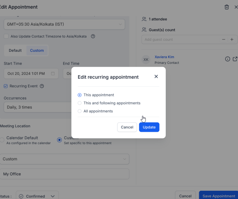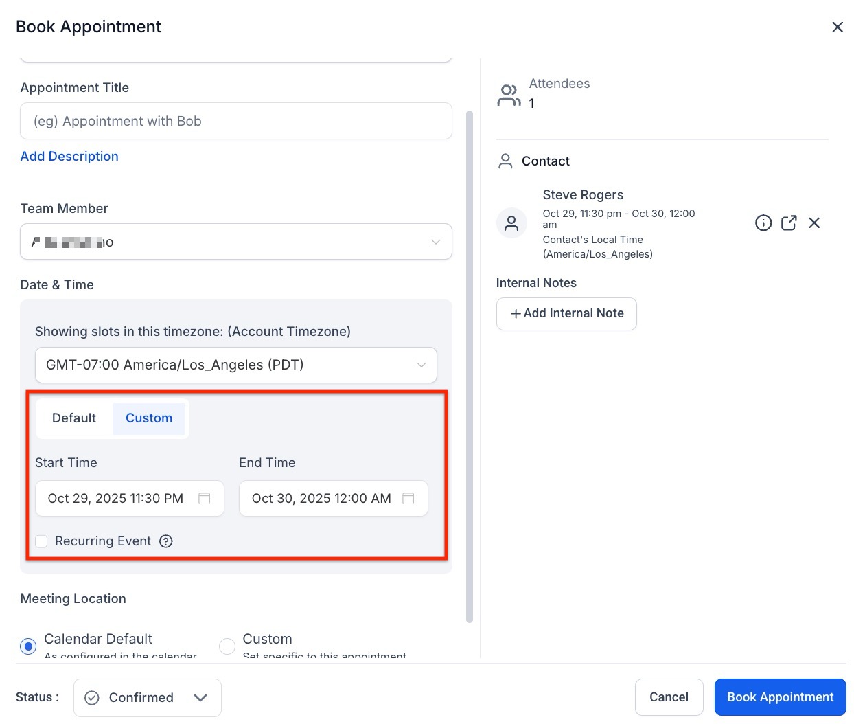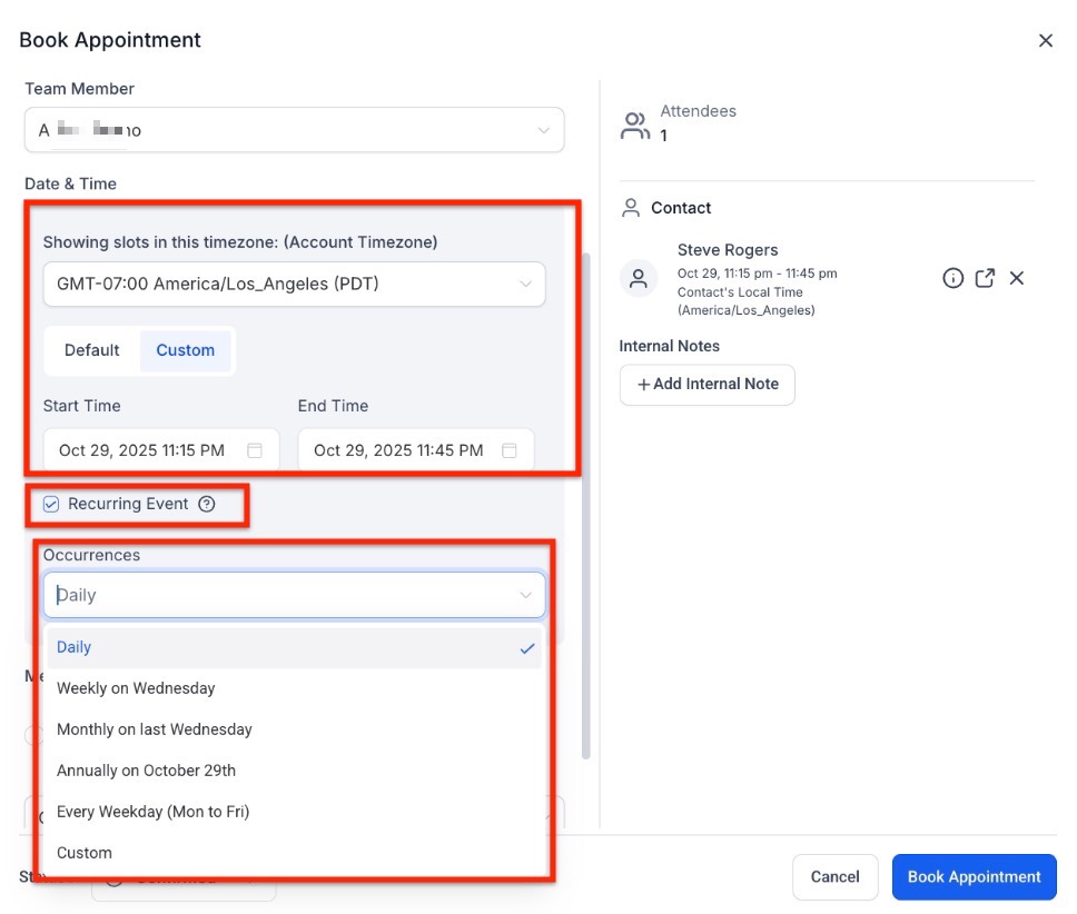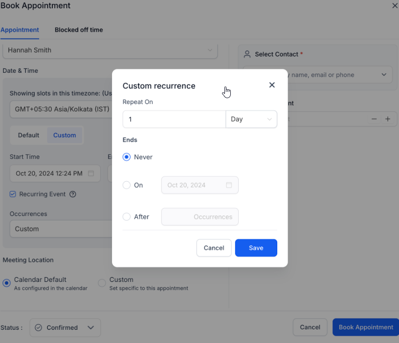 - When creating an appointment through the Custom Date & Time tab in the in-app appointment modal, you have the option to set a specific recurrence rule for the entire appointment series. This custom recurrence will take precedence over your calendar settings.