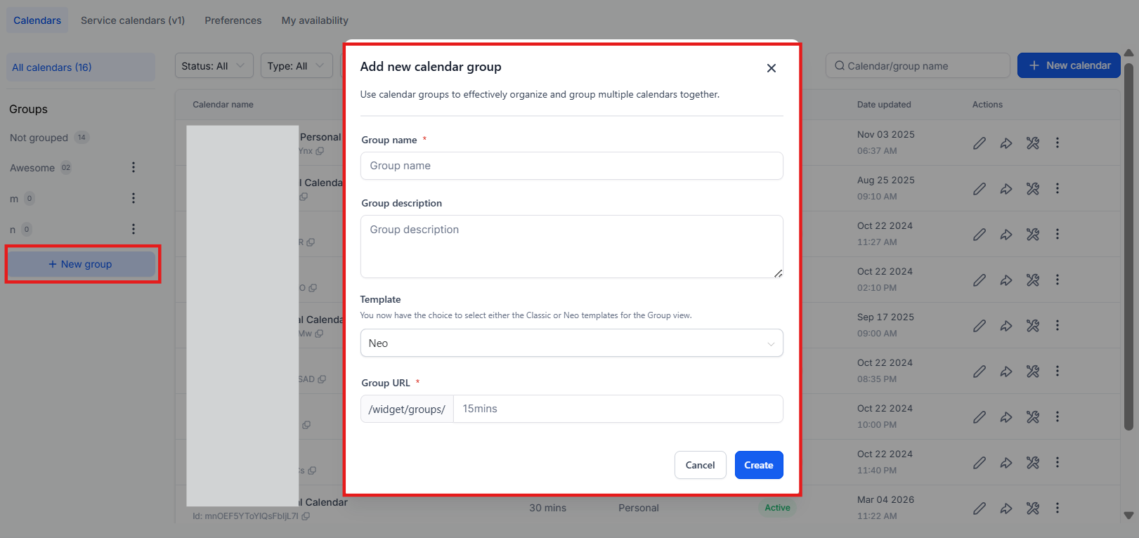 **Question:How do I create a group using the Neo Group View Template? Answer: To create a group with the Neo Template, access Calendar Settings, select Groups, click on “Create Group,” choose the “Neo” template, fill in the group details, and click “Create.