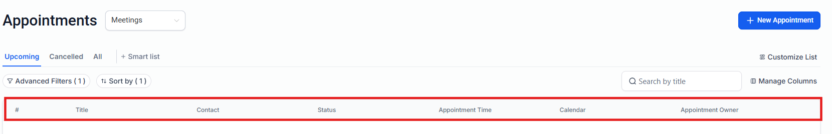 Section titled “Default Columns”The appointment list includes essential fields to track appointment details:
