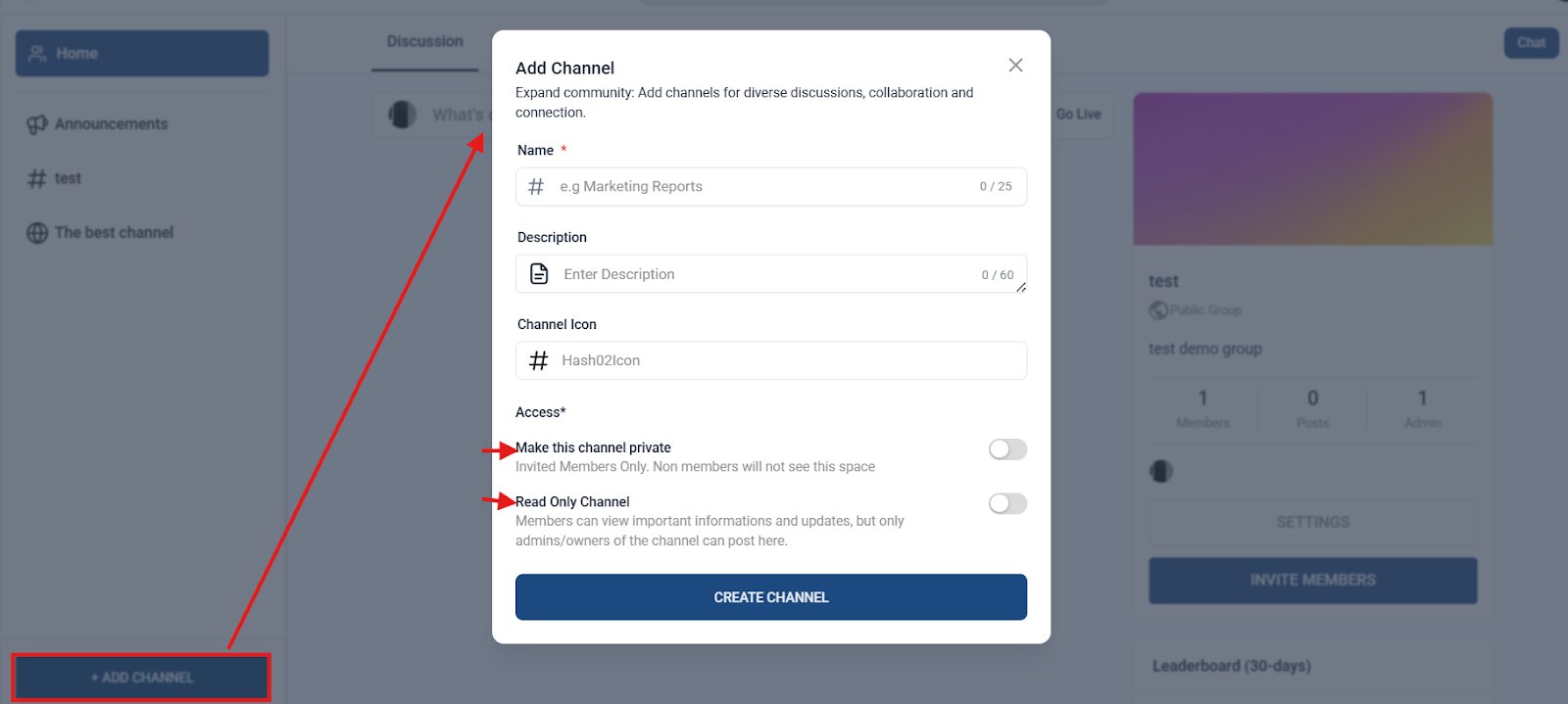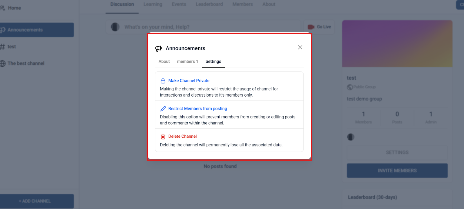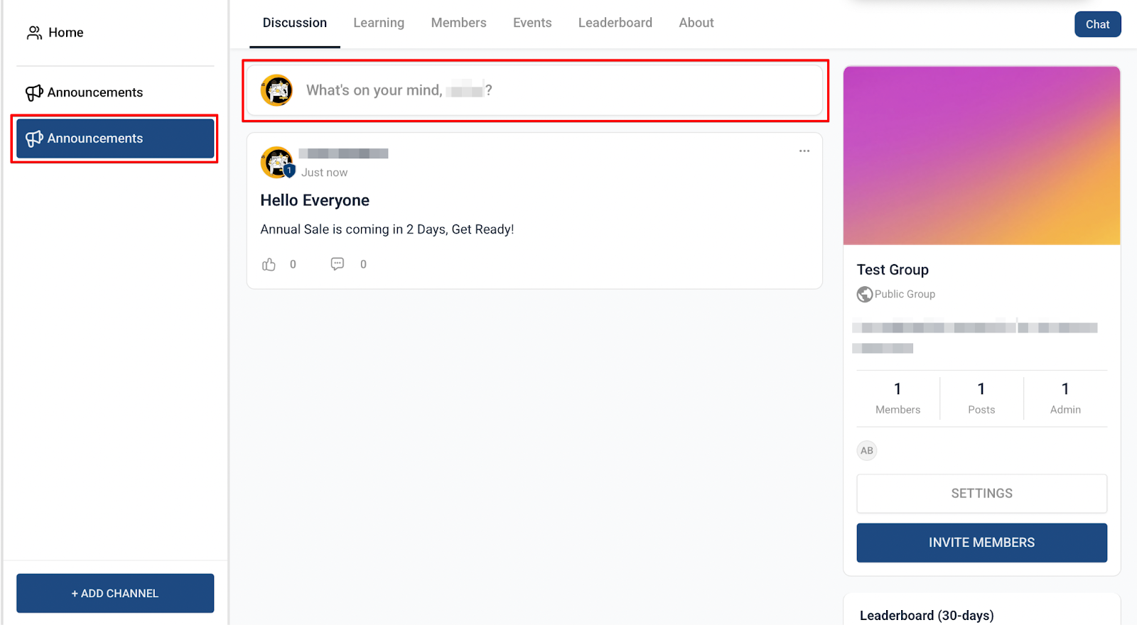 Section titled “Dedicated Announcement Channel”- Admins can create a specialized “Announcement Channel” for official updates.