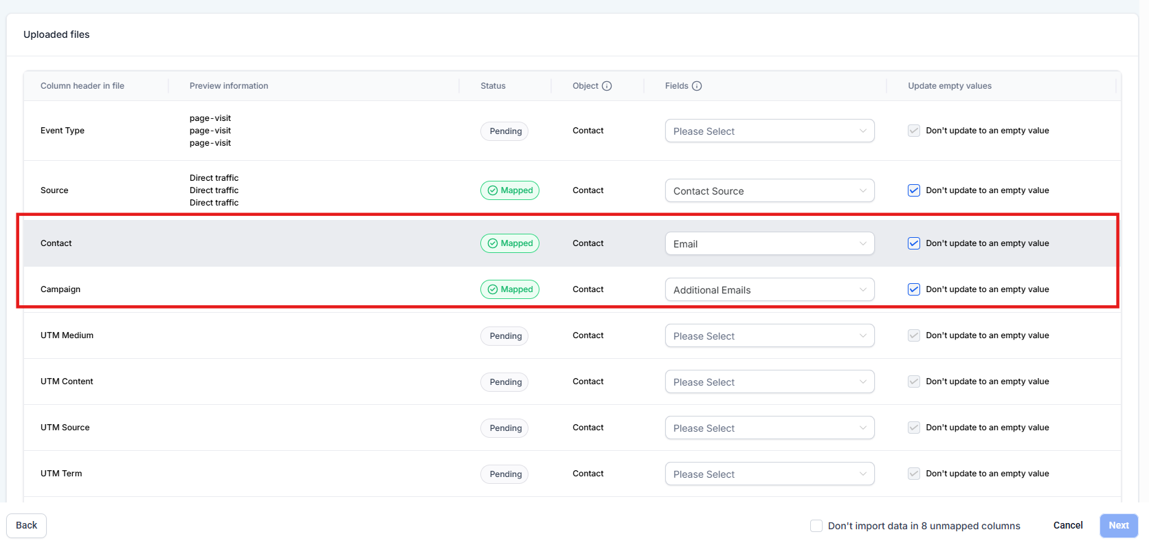 - When updating an existing contact, the specified emails in the CSV will merge with the emails already linked to the contact.