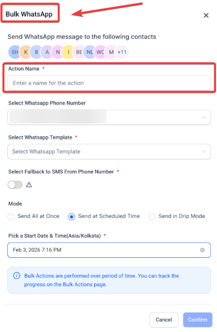 Important: Please be aware that once the Meta Messaging Limit is exceeded, any remaining WhatsApp messages will not be delivered. To avoid this, ensure you do not exceed the message limit set by Meta for your WhatsApp number when initiating a Bulk WhatsApp action. Also, verify that the selected contacts are within the 24-hour messaging limit.