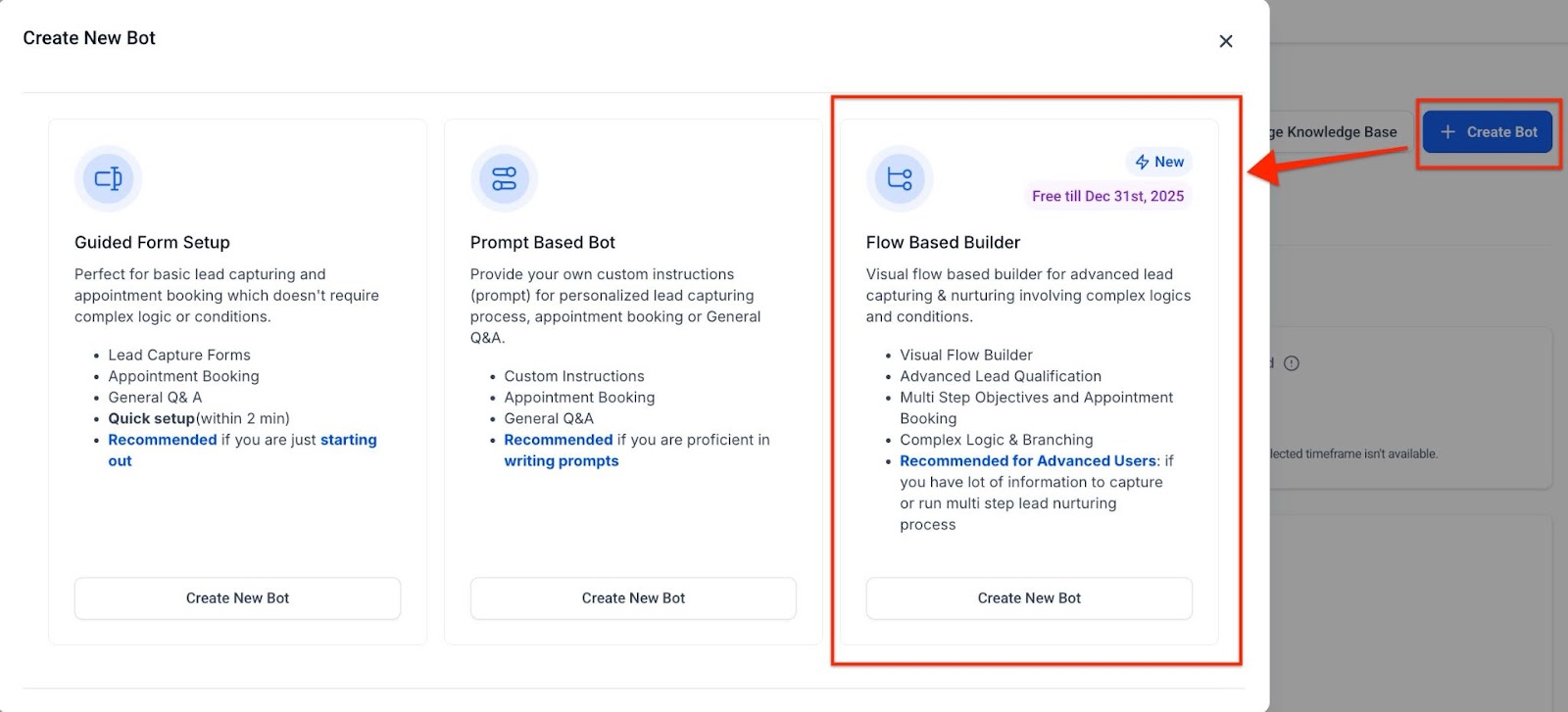 1- Access the Builder: Navigate to AI Agents > Conversation AI section and select the Agents List. Click on ‘Create Bot’ and select the Flow Builder.